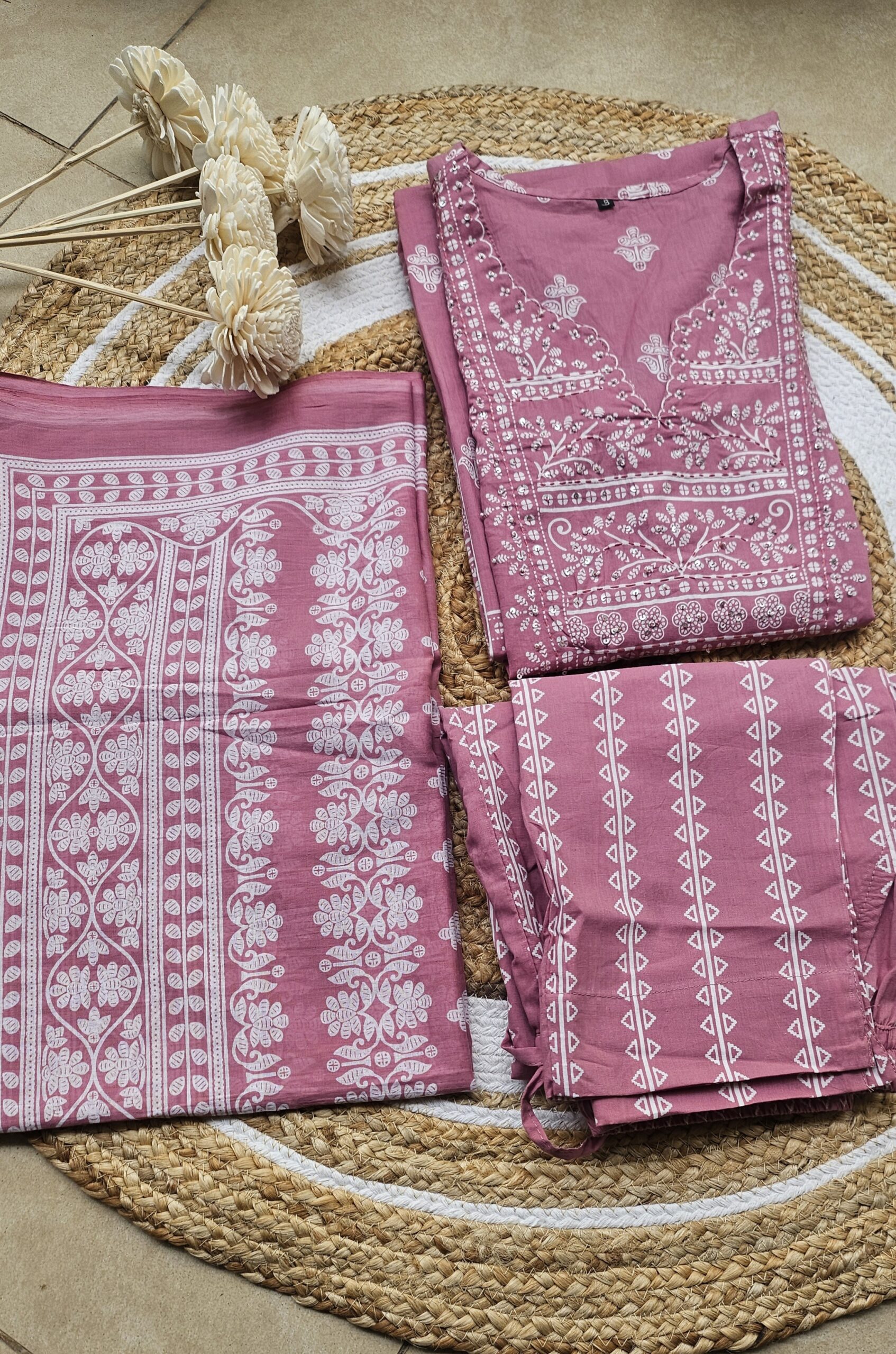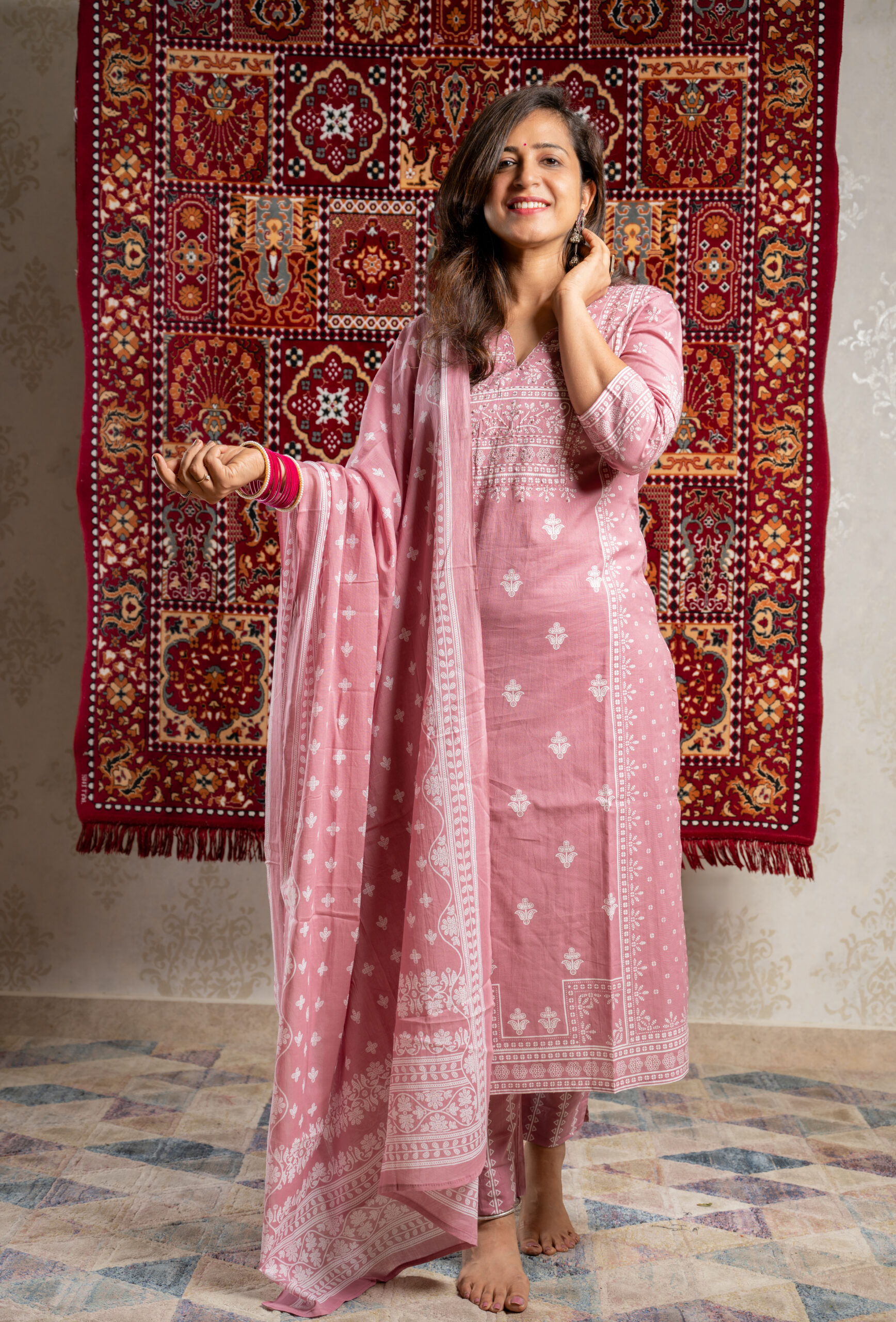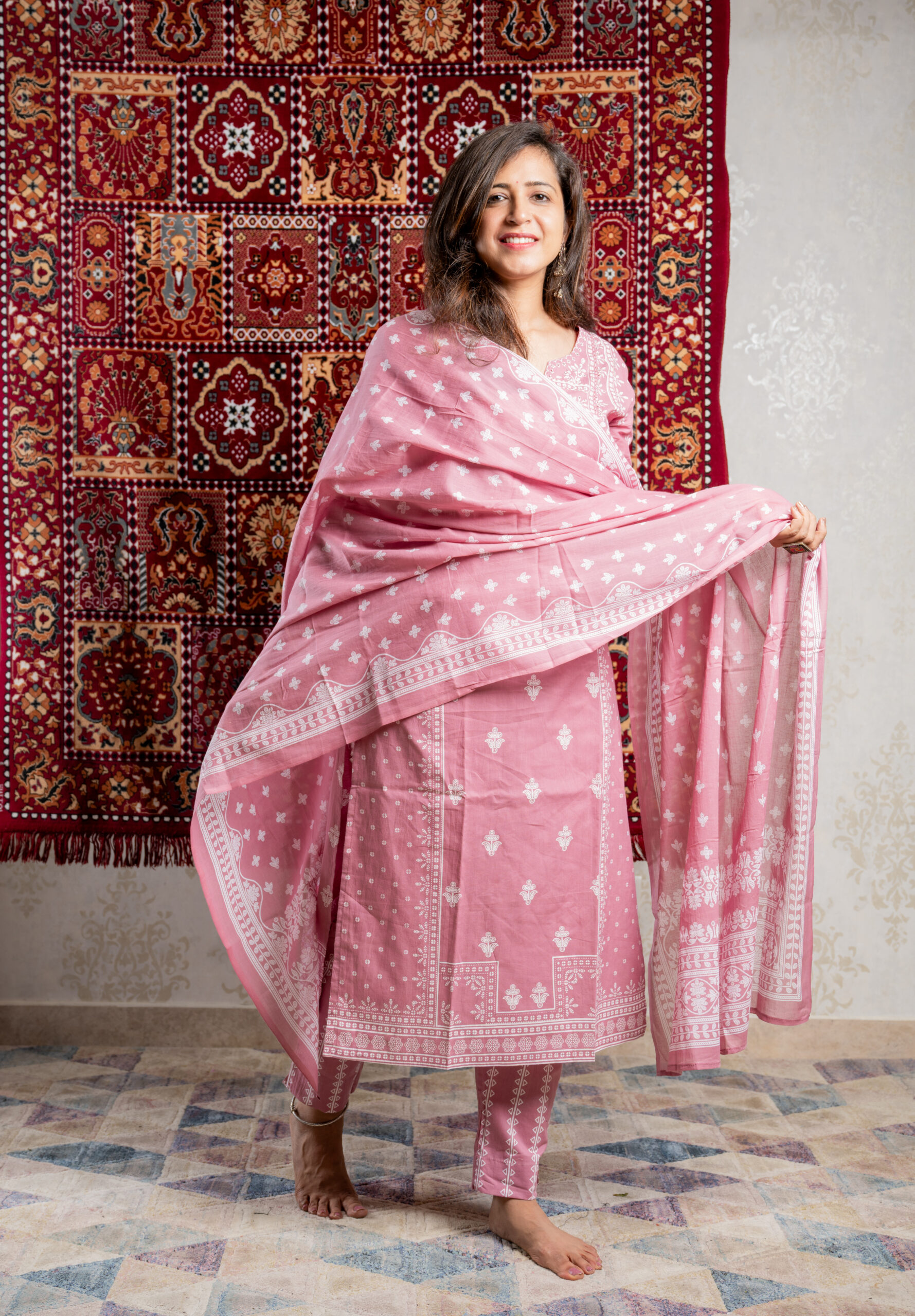 Gulbahar Rose Pink Handloom Cotton Suit Set with Jaipur-inspired white motifs.