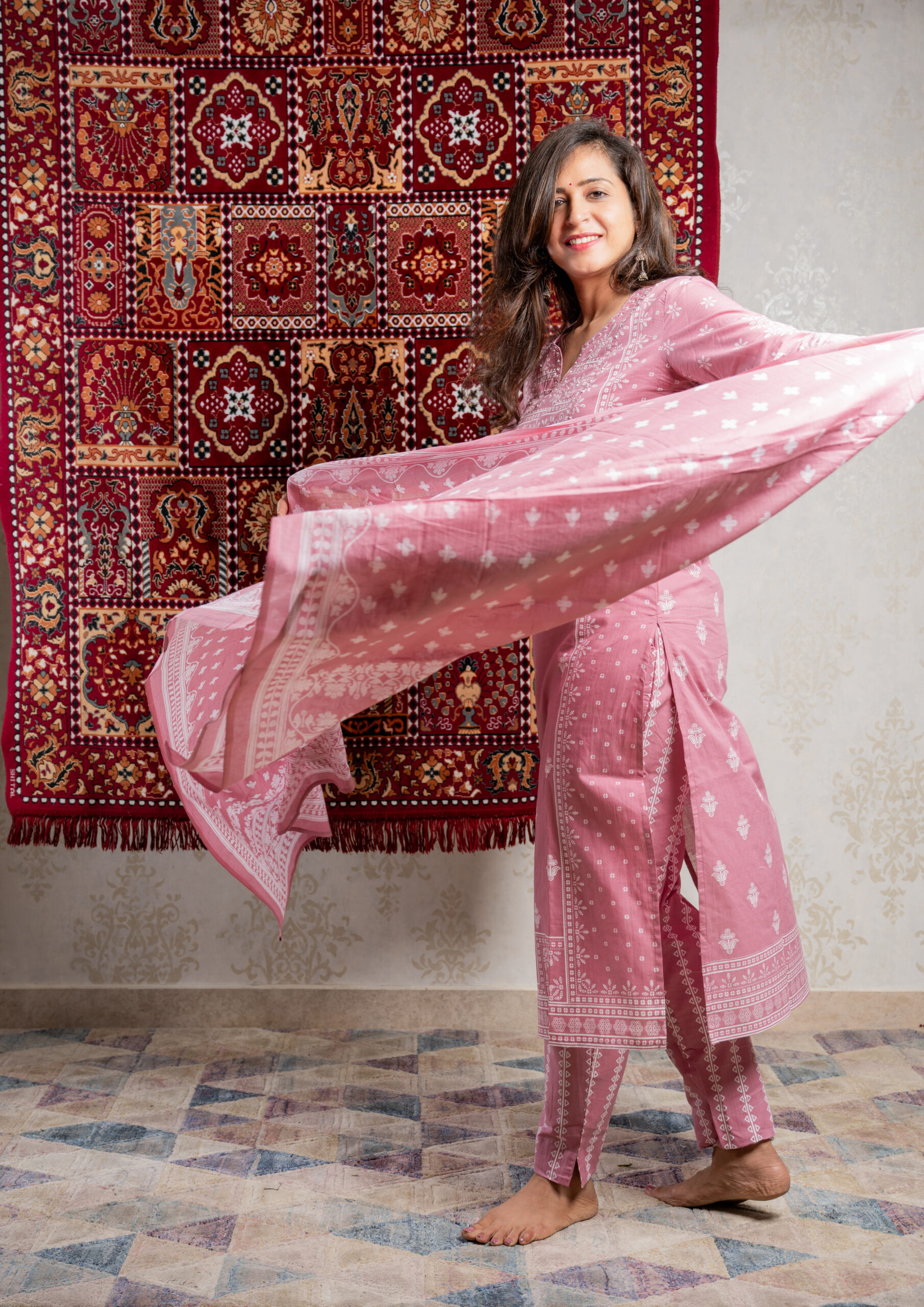 Gulbahar Rose Pink Handloom Cotton Suit Set reflects the gentle elegance of Jaipur’s weaving and printing traditions. The soft rose pink base is highlighted with delicate white motifs, giving the outfit a graceful yet refreshing appeal.